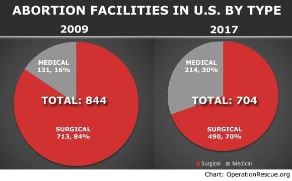 Surgical abortion clinics decreased in number by 26% since 2009, the first year Operation Rescue began keeping records. Overall, there has been a 17% decrease in the total number of abortion facilities in America since 2009.