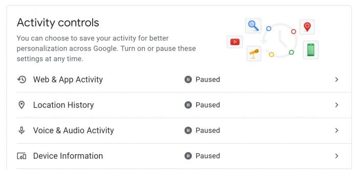 You need to go to your account and click on Data & Personalization and turn off all the ways Google spies on you.