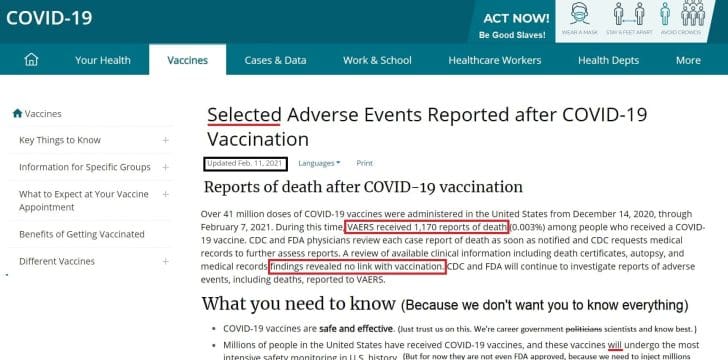 These drug pushers are doing nothing but lying to the American people and at the cost of lives. I reported on Thursday that the January Vaccine Adverse Events Report indicated nearly 3,000 entries and almost 460 deaths. However, the Center for Disease Control is now saying that from the middle of December to the first … Continue reading More Media Blackout – Report: Nearly 1,200 Dead Following COVID Vaxx In US In Less Than 2 Months – CDC: “You Need To Know” These Are “Safe & Effective”