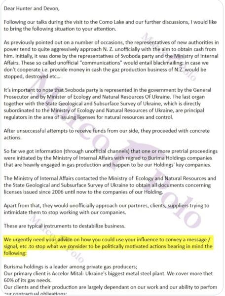 In a previous email, Pozharskyi requested advice from Hunter on leveraging his influence to benefit the company.