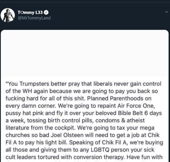 Still, the post continued, “We’re going to tax your mega churches so bad Joel Olsteen will need to get a job at Chik Fil A to pay his light bill.  Speaking of Chik Fil A, we’re buying all those and giving them to any LGBTQ person your sick cult leaders tortured with conversion therapy.  Have fun with the new menu you bigoted (expletive).  Try the McPence.  It’s a boiled unseasoned chicken breast that you have to eat in the closet with your mother.”